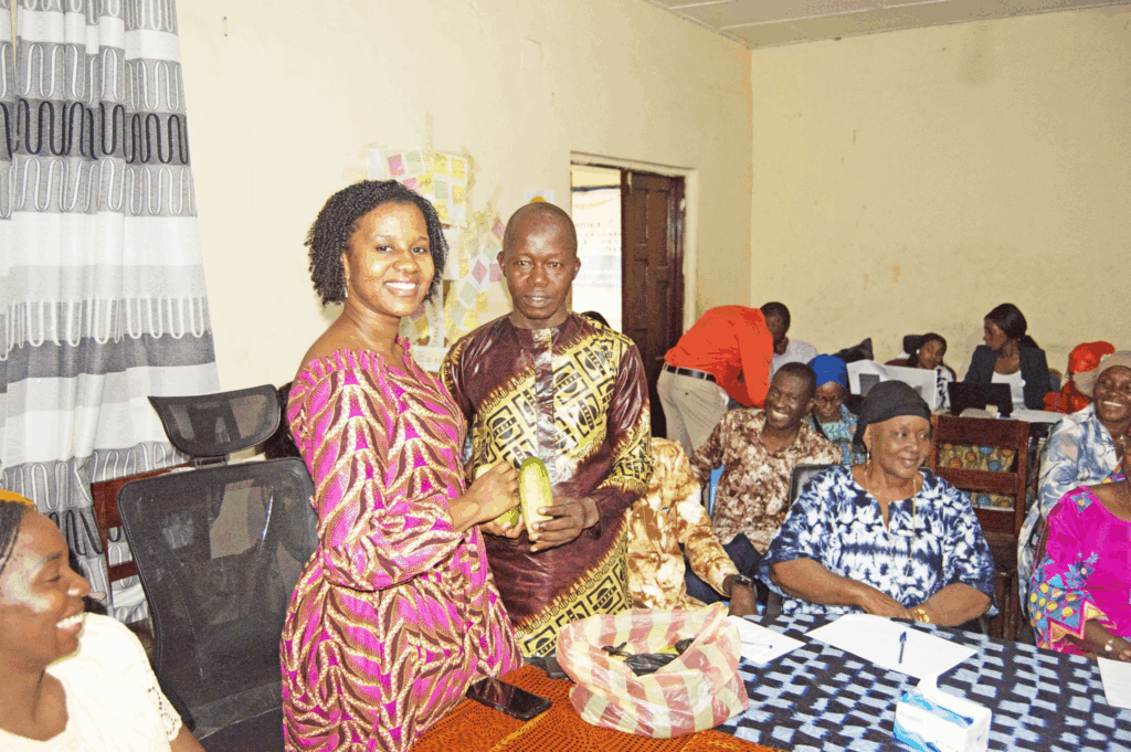 À la fin de la projection, le Directeur de l’École Primaire de Lansanaya, l’une des écoles pilotes, a remis à Madame Bah des concombres fraîchement récoltés – symbole vivant du fruit de ce partenariat.