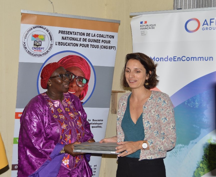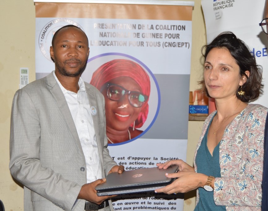 « L’AFD, vous savez, c’est une agence qui fait partie de l’équipe France tout comme France Volontaires. L’AFD nous a mis en relation avec la coalition et aujourd’hui l’AFD vient d’offrir un lot d’ordinateurs à la CNG//EPT pour leur permettre de renforcer le travail qui est fait dans le cadre du suivi de l’administration scolaire. Il s’agit d’un partenariat qui sera axé sur l’éducation, sur les objectifs de développement durable 4, puisqu’il s’agit de voir dans quelle mesure il y a des progressions. L’État guinéen a mis en place un programme qui s’appelle le PRODEG (Programme Décennal de l’Éducation en Guinée), et la coalition, avec l’ensemble des partenaires, fait le suivi de ce programme-là. Nous savons très bien que l’AFD est un partenaire technique et financier qui accompagne ce programme, et nous, en tant qu’acteurs de la société civile, la coalition a son rôle à jouer pour améliorer ce programme-là auprès des communautés. Donc aujourd’hui, l’octroi des ordinateurs va permettre aussi à l’équipe de la coalition de pouvoir renforcer le travail qui est fait sur le terrain en matière de suivi de la mise en œuvre de ce programme », a-t-il laissé entendre.